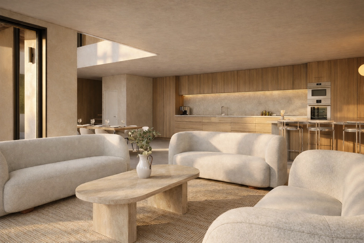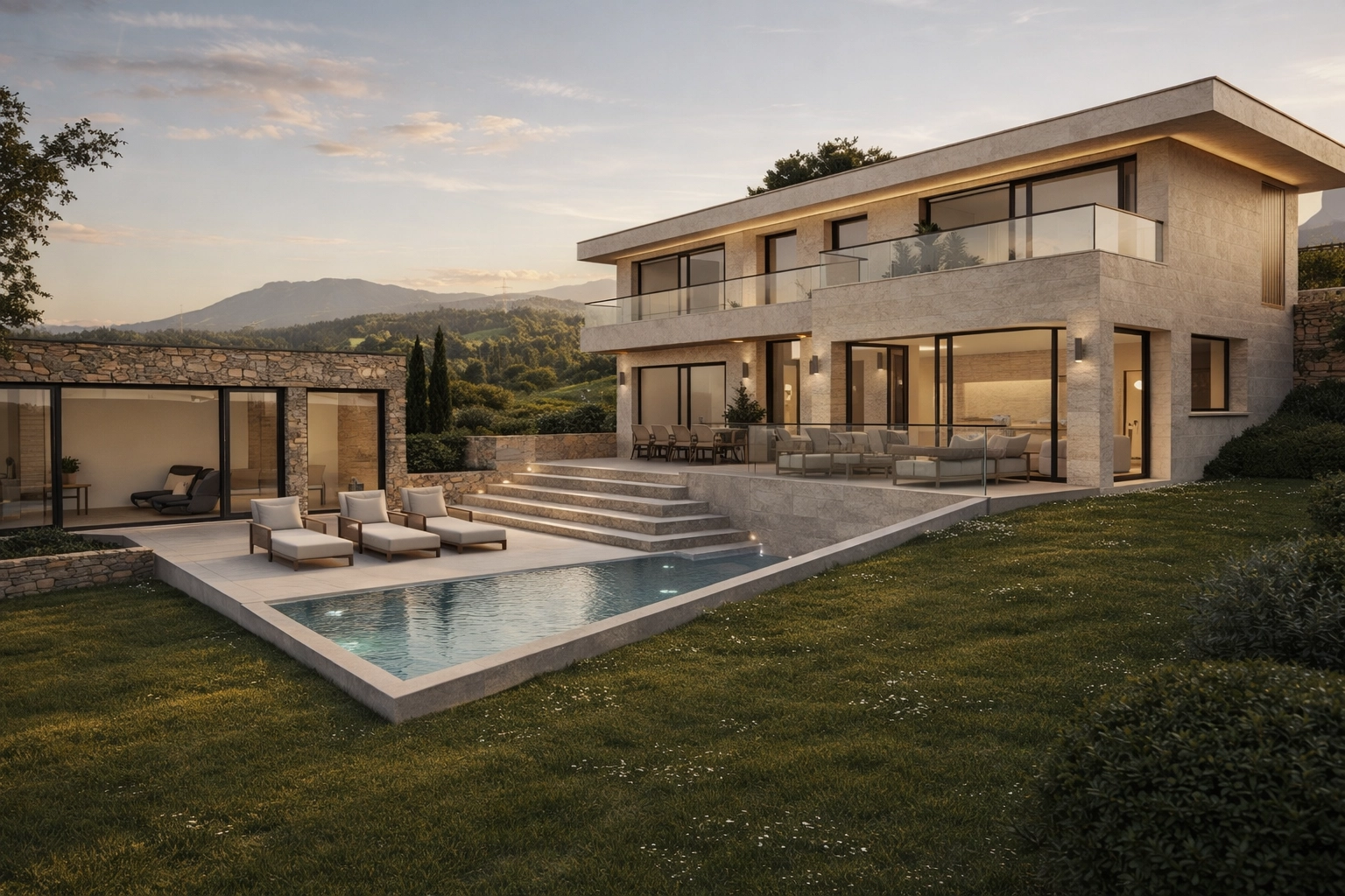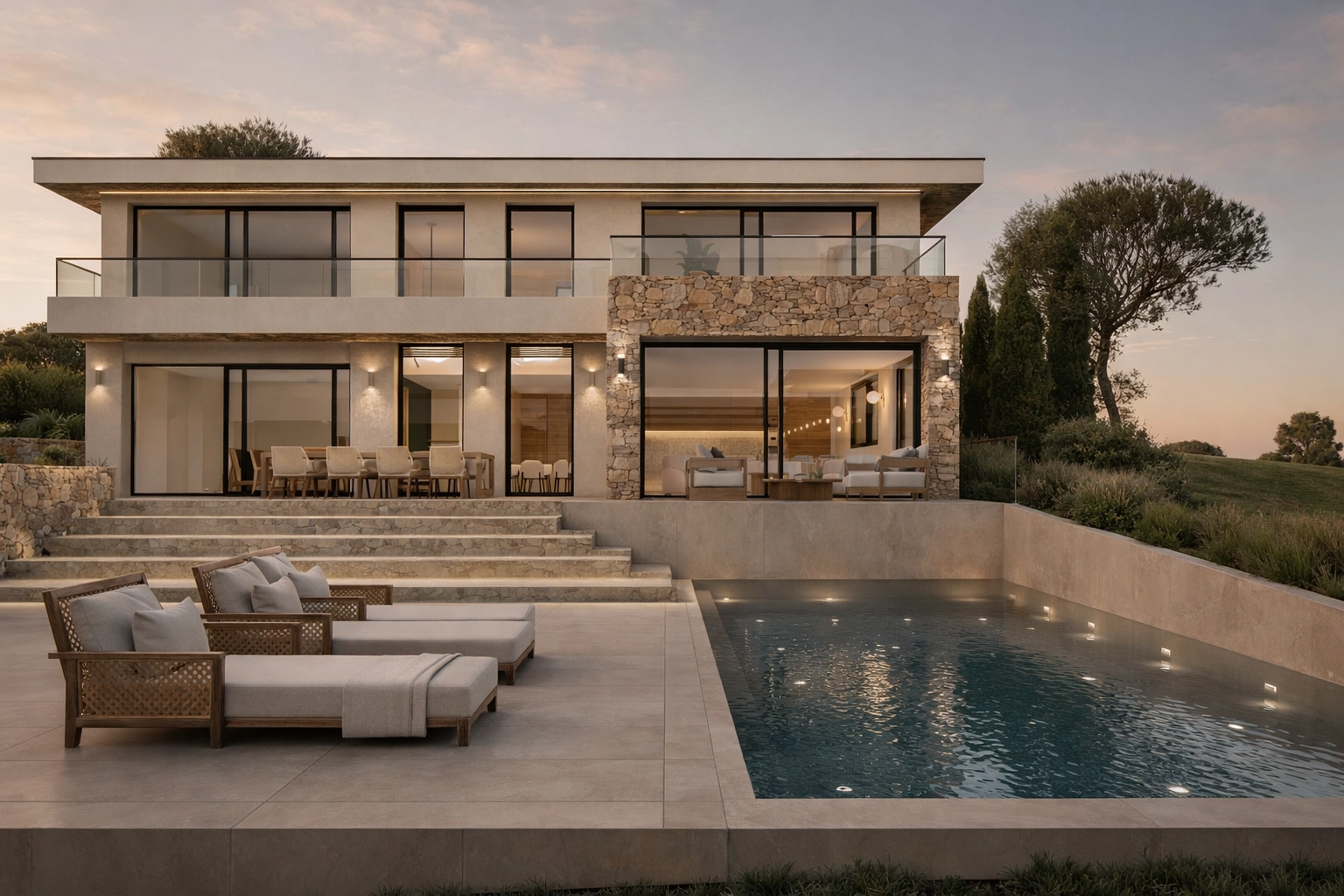 La villa imaginée développe environ 205 m² habitables complétés par un garage de 30 m². L’architecture contemporaine privilégie les lignes épurées, les volumes généreux et une relation permanente avec l’extérieur. Les espaces de vie largement ouverts profitent d’une luminosité naturelle remarquable et se prolongent vers de vastes terrasses et un espace piscine parfaitement intégré au jardin.