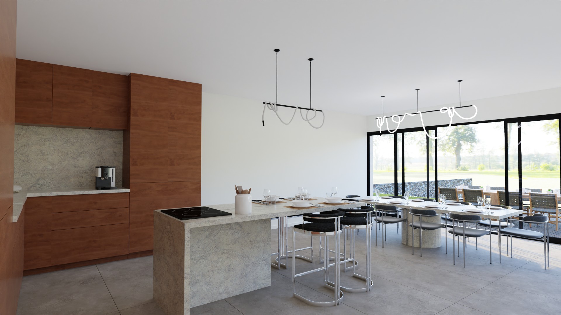 À l’extérieur, 112 m² de terrasses carrelées et couvertes s’ouvrent sur la piscine, créant une continuité naturelle entre intérieur et extérieur.