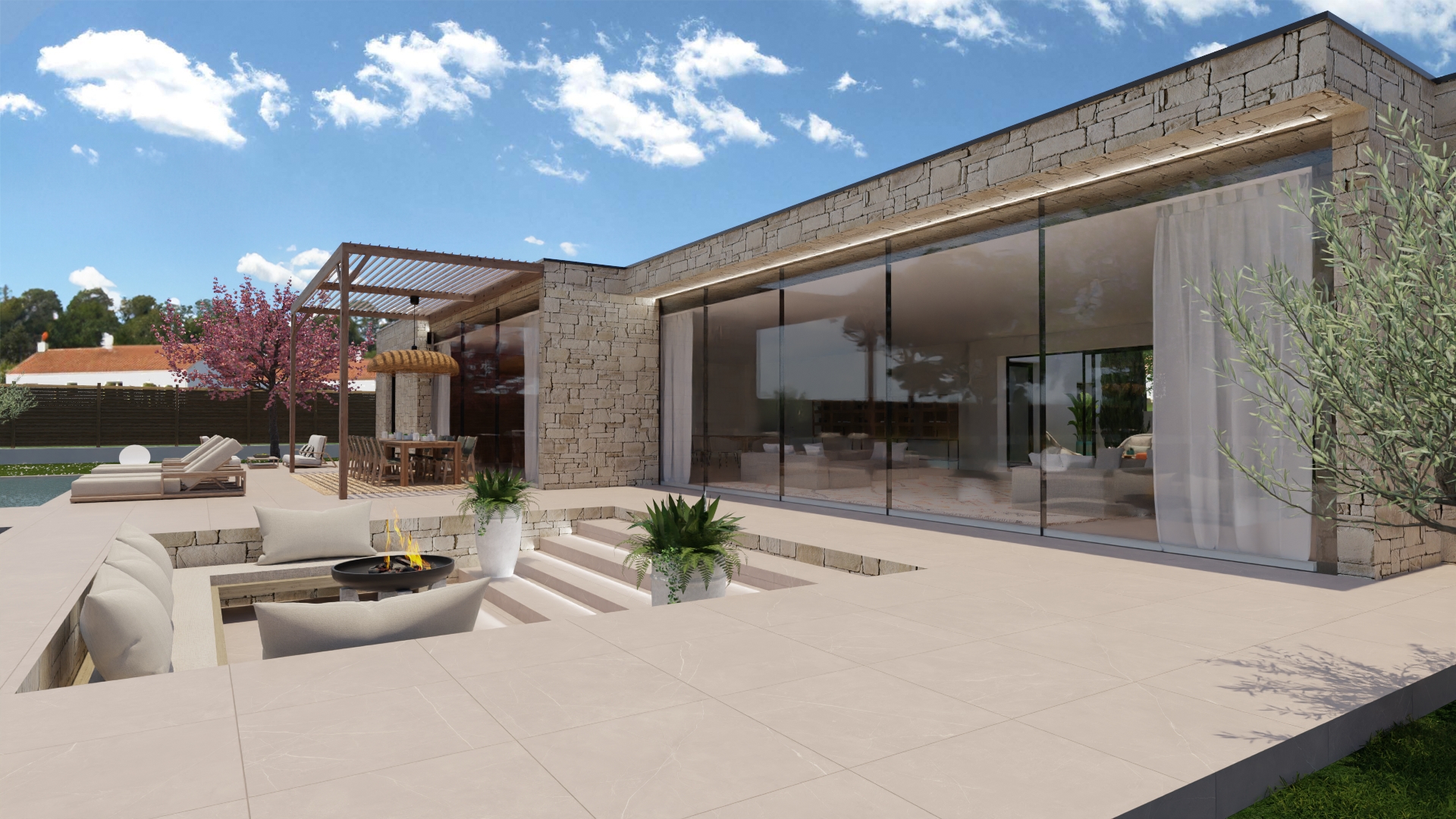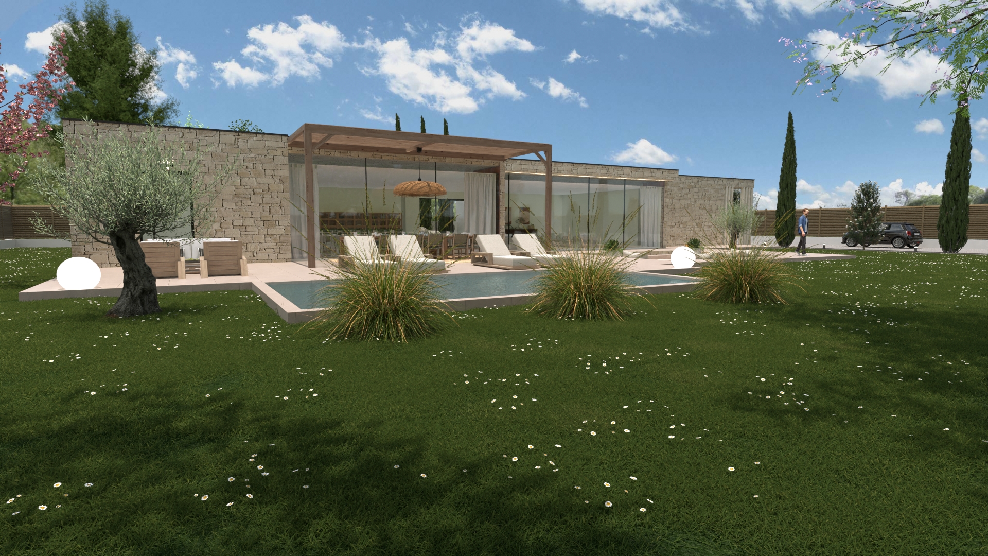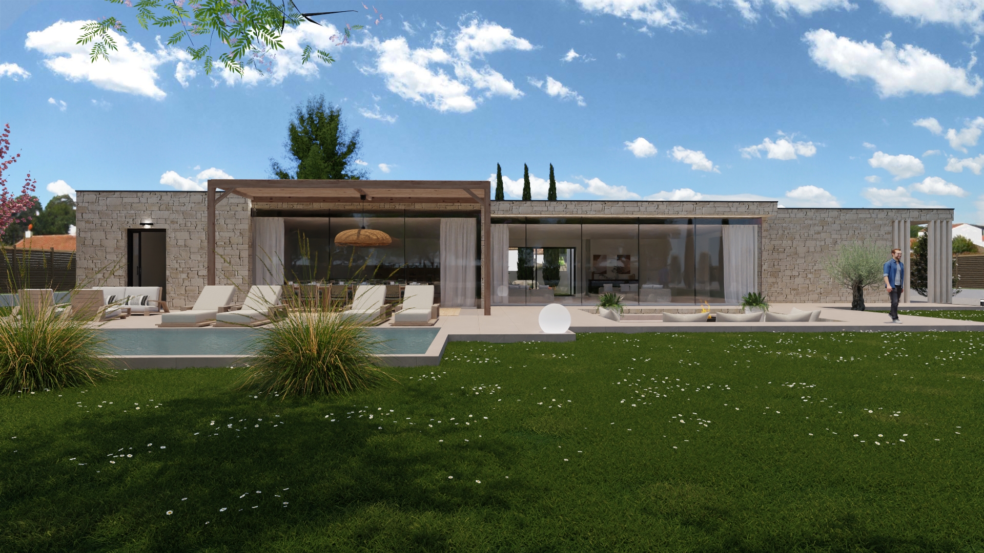 Cette création NEOABITA offre des volumes exceptionnels, une hauteur sous plafond de 3 mètres, et de larges baies vitrées ouvrant sur la terrasse, la piscine et les espaces paysagers.