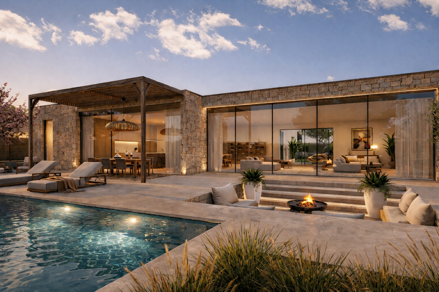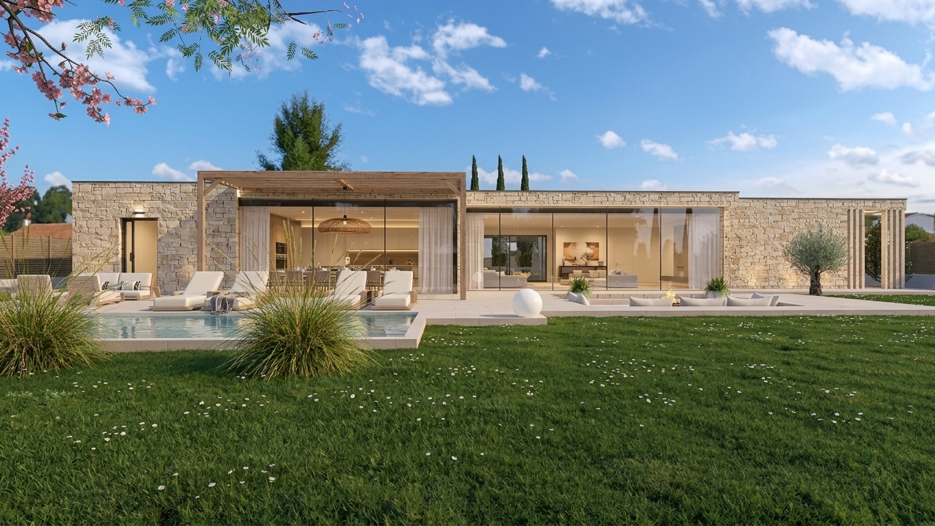 Un patio central vient structurer les volumes et créer un véritable lien entre intérieur et extérieur. Prestations haut de gamme, matériaux premium et finitions architecte complètent l’ensemble.