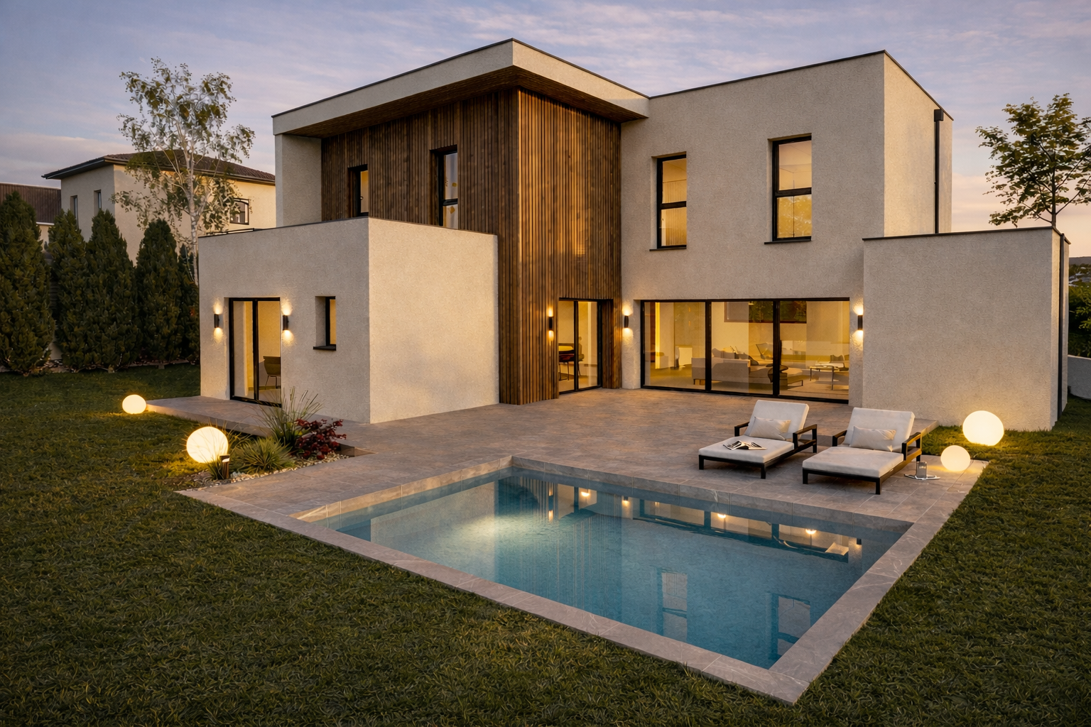 Dès les premiers regards, le projet séduit par son écriture architecturale élégante, mêlant volumes épurés et jeux de matières. L’implantation sur la parcelle a été soigneusement étudiée afin d’optimiser l’ensoleillement et de créer une véritable relation entre les espaces intérieurs et extérieurs, offrant ainsi une qualité de vie rare dans un environnement calme et privilégié.